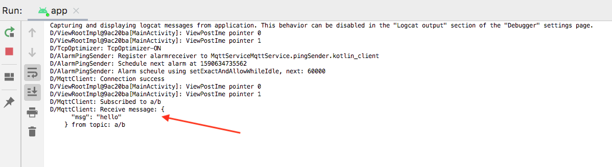 Log.d(TAG, "Receive message: ${message.toString()} from topic: $topic")