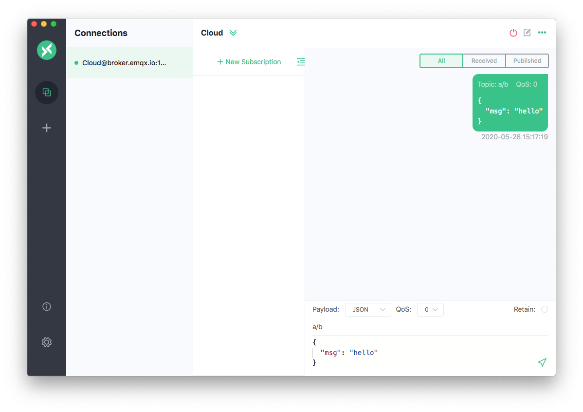 然后我们使用 MQTT 5.0 客户端工具 - MQTT X 进行测试,发布消息到 topic: a/b,客户端可以看到收到消息的日志