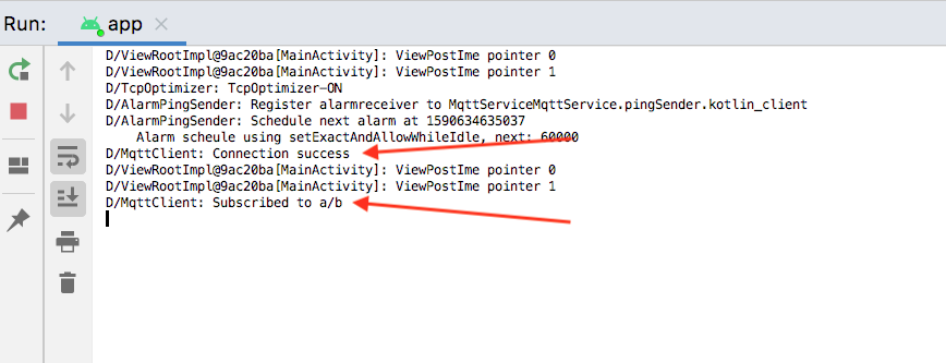 首先将 Android 客户端连接到 MQTT 服务器,然后订阅 topic: a/b,可以看到连接成功和成功订阅的日志