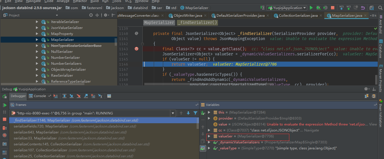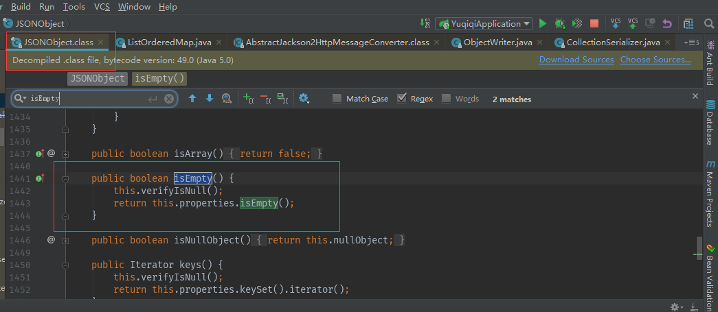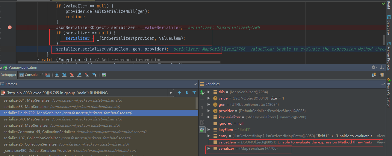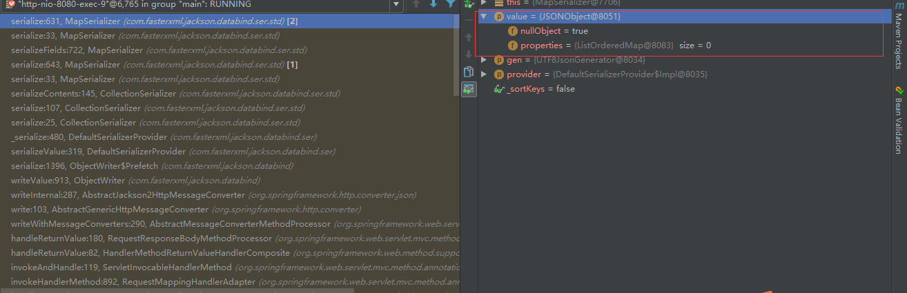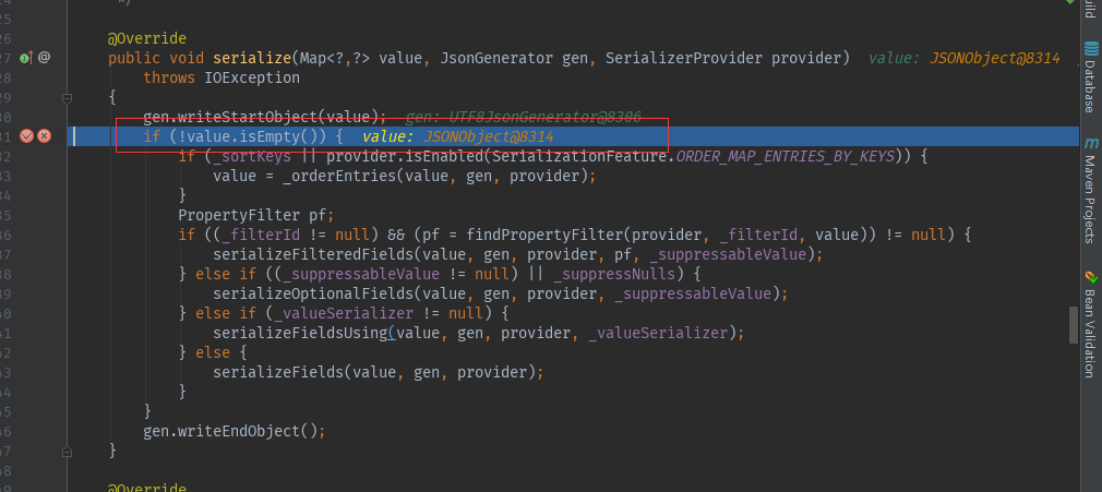接着在执行 serializer.serialize(valueElem, gen, provider); 到下图时,valueElem 是JSONObject对象,查看对象里面的 isEmpty 源码