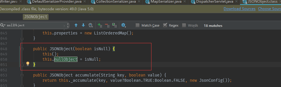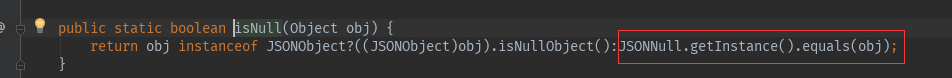 此时的object是一个JSONNull 对象,所以1中的前半段是true,isNull代码如图会走入红框中的逻辑所以是true 在进行!运算成了false 所以直接进入了分支2,返回的是一个JSONObject 对象 ,重点啊,记住这个构造函数 记住这个true,以及它是实现MAP 接口的