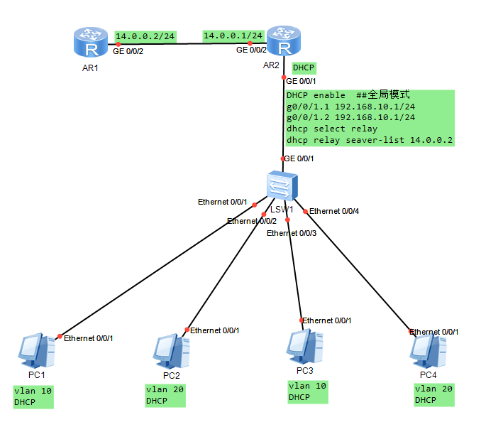 15.dhcp relay seaver-ip 14.0.0.2 DHCP中继服务器地址14.0.0.2