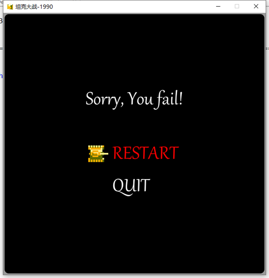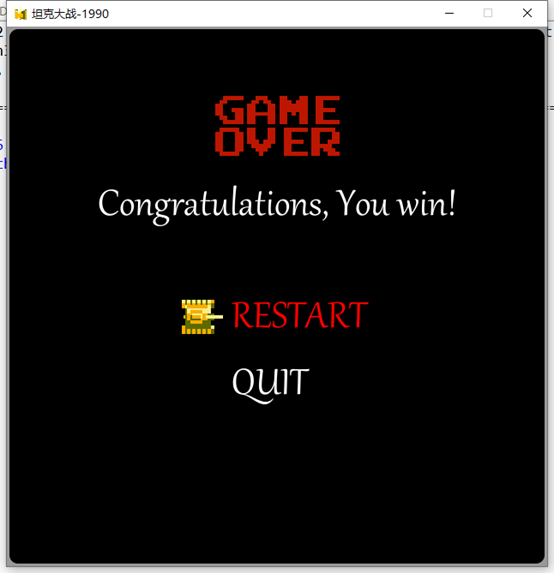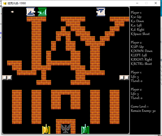 玩家坦克与敌方坦克在地图上进行作战,当我方坦克生命数为0或者大本营被击毁时出现 Game Over,当敌方坦克全部死亡时出现Congratulations。