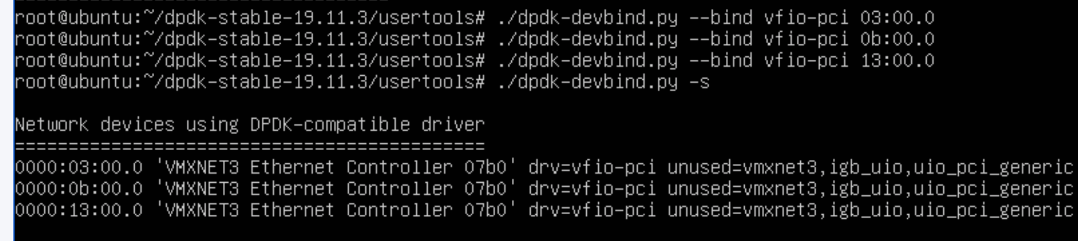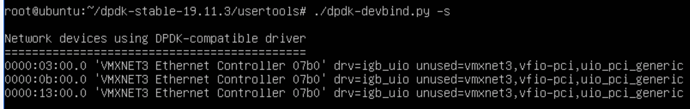 这里找到一篇描述vmxnet3的,说是igb_uio不支持,需要将UIO的驱动切换到vfio-pci,下面进行测试