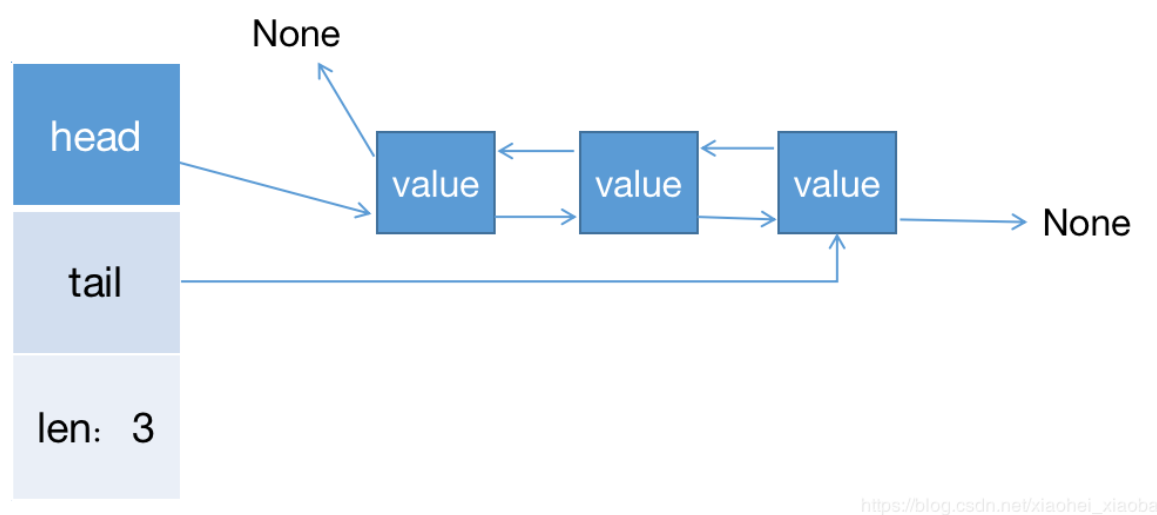 linkedlist有三个属性,head,tail和len。head指向链表的头部,tail指向链表的尾部,len为链表的长度。