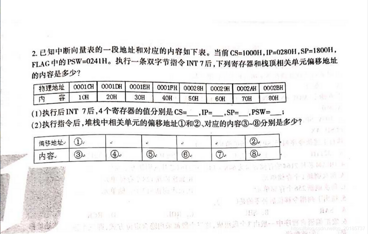 微机原理:当前CS=1000H,IP=0280H,SP=1800H,PS=W0241H,执行INT 7后,寄存器和栈顶相关单元的内容是什么?