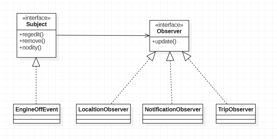 例如:当汽车熄火时,需要更新汽车的定位、发送熄火的通知、生成本次的行程,就可以使用观察者模式,这个例子中发生变化的位置是熄火,那么发生熄火需要通知依赖它的一些对象,就是定位、通知和行程。