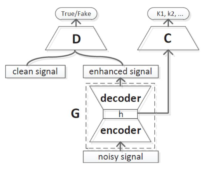 | 研究方法 | 语音识别模型的噪声鲁棒性问题主要来源于纯净训练数据和带噪测试数据的分布差异。生成式对抗网络(Generative Adversarial Networks, GAN)可以通过对抗训练的方式,连续逼近指定的数据分布。GAN由生成器和判别器组成,生成器用来生成样本,判别器用来判断样本是否来自真实训练集。二者进行对抗训练,使得生成器生成的样本尽可能逼近真实训练数据。 针对语音识别系统在噪声环境下识别性能下降的问题,作者提出深度对抗和声学模型联合训练的框架,如下图所示,框架由生成器(G)、判别器(D)以及分类器(C)组成。生成器用来把带噪语音数据分布变成纯净语音;判别器用来判定语音信号是否来自真实纯净训练集;声学模型作为分类器,指导生成器提取区分性特征。生成器、判别器和声学模型进行联合对抗训练,三者相互配合相互促进。