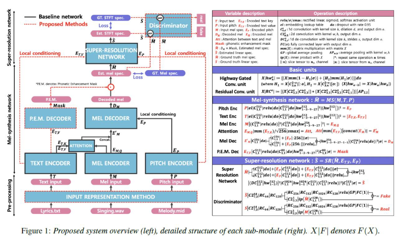 | 研究结果 | 实验使用手工收集整理的歌声数据集,包含了60首流行歌曲。实验表明使用文本信息对phonetic enhancement mask进行建模是有效的,能够生成更为准确的发音。同时在super-resolution阶段使用条件对抗(conditional adversarial)训练方法能够获得更高的声音质量。 |