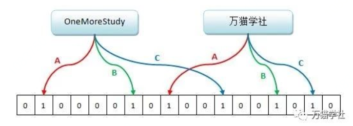 Redis中布隆过滤器的数据结构就是一个很大的位数组和几个不一样的无偏哈希函数(能把元素的哈希值算得比较平均,能让元素被哈希到位数组中的位置比较随机)。如下图,A、B、C就是三个这样的哈希函数,分别对“OneMoreStudy”和“万猫学社”这两个元素进行哈希,位数组的对应位置则被设置为1: