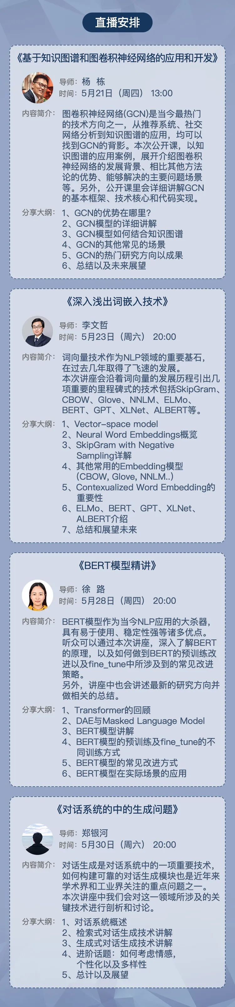这次的系列课程我们又选择了近几年NLP领域最火的话题,包括GNN, GCN, Word2Vec, ELMo, GPT, BERT, 对话系统,个性化文本生成,知识图谱等内容。作为一名NLP工程师,这些内容逐步在成为必修课。在本次专题活动,我们会通俗易懂地讲解每一个核心知识点,让大家知道背后的原理,这也是贪心学院一贯的讲授风格。