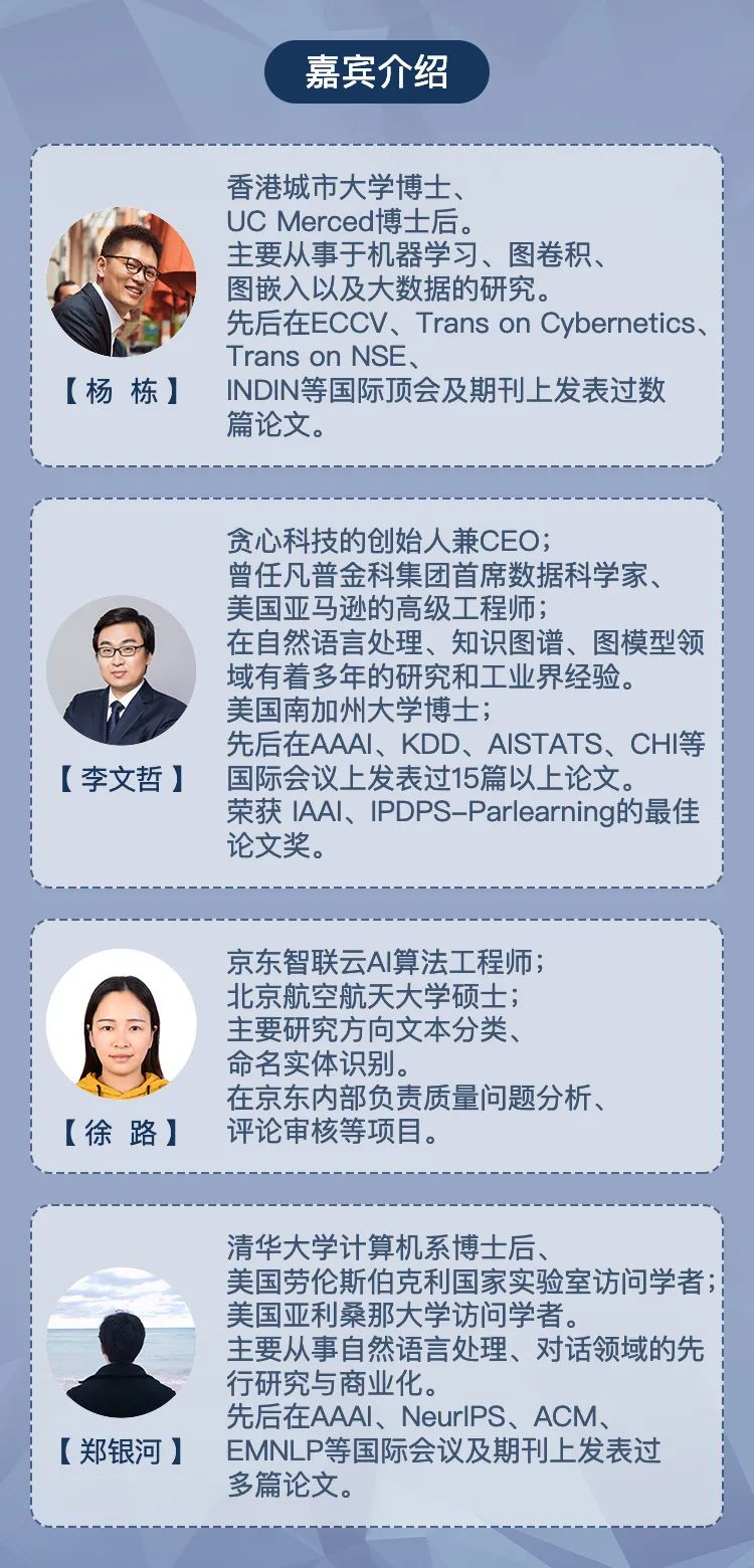 本次的专题活动,我们有幸邀请到了多位国内外NLP领域的专家,均在各自领域中发表过数篇顶会文章,也有幸邀请到了京东相关领域的专家。我们希望通过本次活动,给大家带来一些认知上的提升,充实自我!