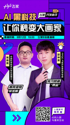 每周三晚上,飞桨开发者说Live,和全球人工智能开发者一起丰富技能,扫描下方二维码加入直播交流群,除了可以直接和分享嘉宾交流,了解更多技术踩坑破解诀窍,更有精彩互动和礼品不容错过哟,勇敢的少年啊,快去创造奇迹!