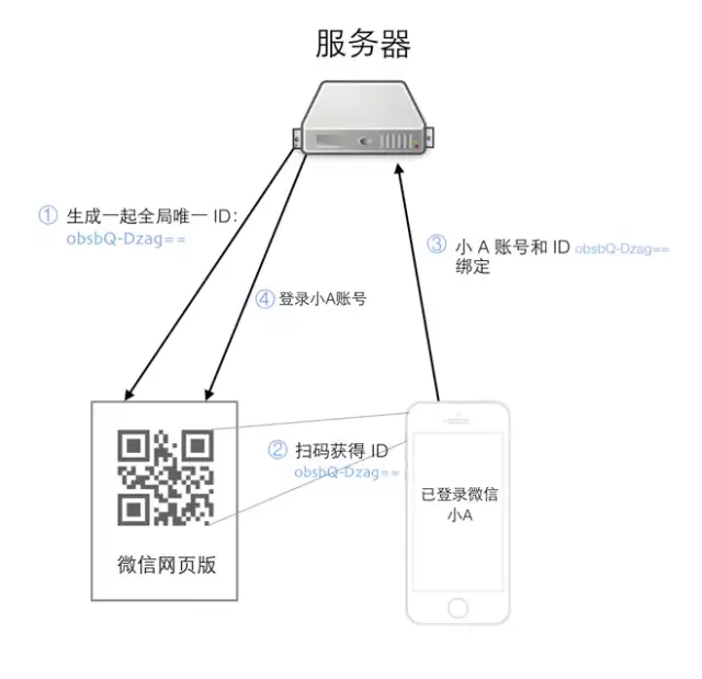 ①:用户 A 访问微信网页版,微信服务器为这个会话生成一个全局唯一的 ID,上面的 URL 中 obsbQ-Dzag== 就是这个 ID,此时系统并不知道访问者是谁。