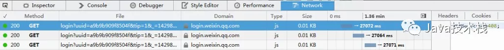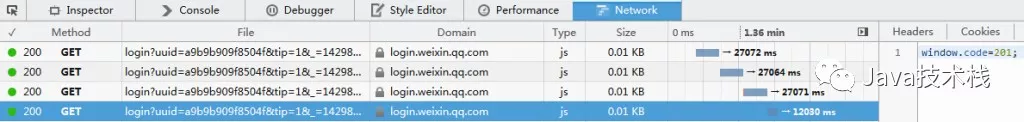 2.除了返回唯一的uid,实际上打开这个页面的时候,浏览器跟服务器还创建了一个长连接,请求uid的扫描记录。如果没有,在特定时长后(目前是27秒左右)会接到状态码408(请求超时),表示应该继续下一次请求;如果接到状态码201(服务器创建新资源成功),表示客户端扫描了该二维码。