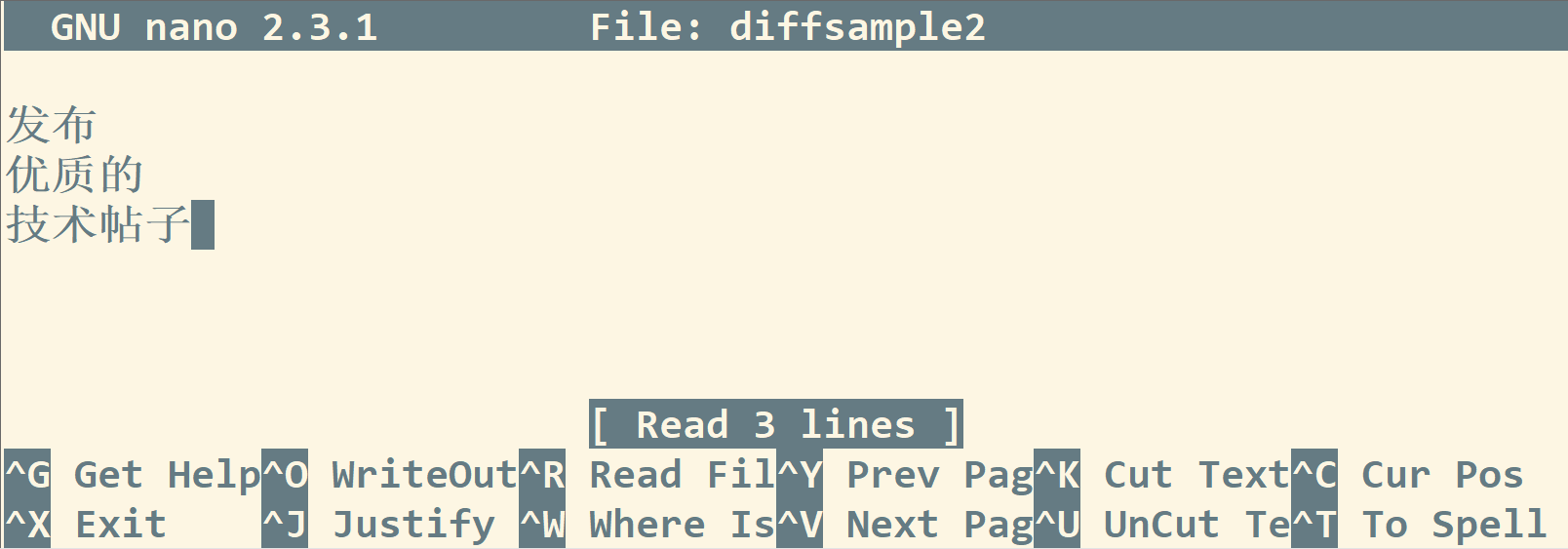 现在我们对 diffsample2 做一些修改,将文章改为帖子然后保存并退出