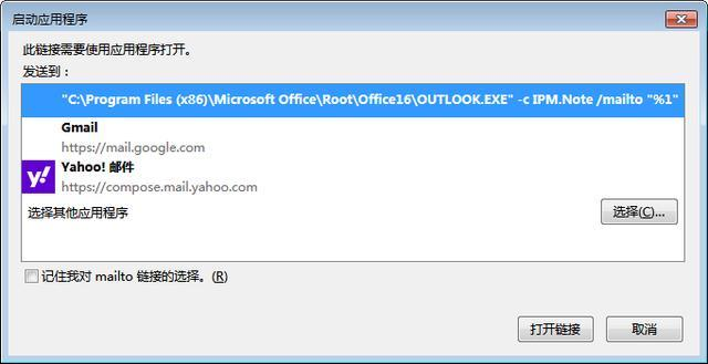 大家可以把邮箱地址改成自己的邮箱试一下,浏览器会让大家选择发送邮件的程序。如图所示: