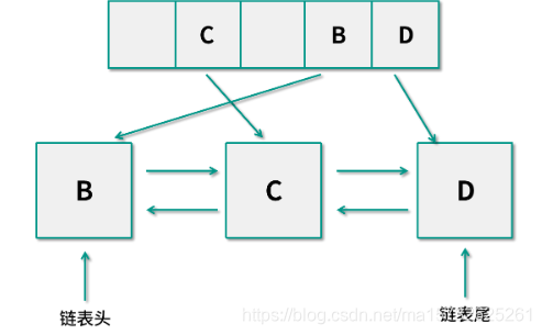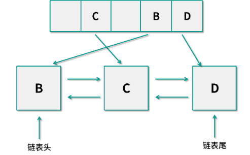 链表:头节点直线缓存中最新数据,尾最老的,新的插入前面;查找O(n)