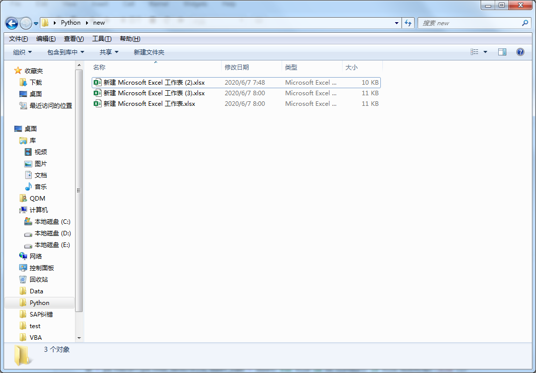 在 C:\Users\QDM\Desktop\Python 路径下有3个工作簿,它们的数据结构相同,且都位于 Sheet1中。如以下截图所示: