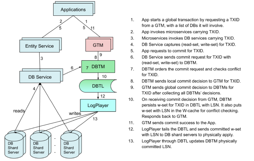 - 逻辑提交(步骤5-11):一旦应用程序请求事务提交,每个数据库服务点的读集和写集都将提交到其DBTM。DBTM使用读集和写集进行冲突检查,以实现本地提交决策。GTM将收集DBTM针对事务的所有本地决策后,做出全局提交决策。一旦将其写集持久保存在所涉及数据库的日志存储(DBTL)中,就在逻辑上提交事务。这涉及GTM和DBTM之间的最小协调。