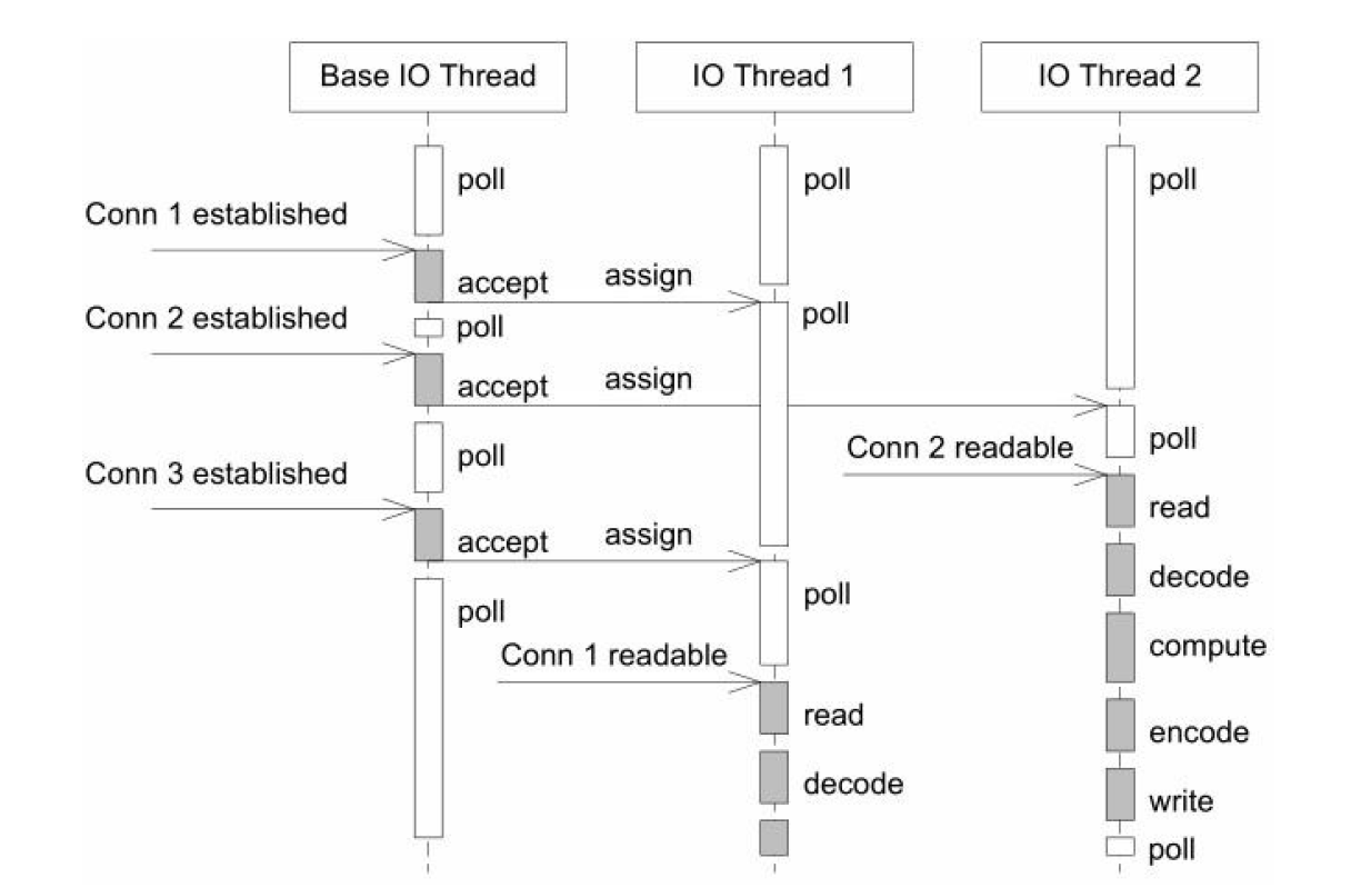 可以看出,每一个线程有一个EventLoop处理事件。这种方案是典型的“one loop per thread”流程,有一个“主EventLoop”负责accept连接,然后把连接通过round-robin(轮询调度)挂到底下的多个“子EventLoop”中(EventLoopThreadPool),每个连接都是由一个“子EventLoop”完成的,能保证请求的顺序性,也可以充分利用CPU,防止出现一个reactor的处理能力饱和,而且EventLoop线程池线程数量固定,不会因为连接数过多到达临界点(线程太多导致操作系统线程调度不过来)而性能下降!