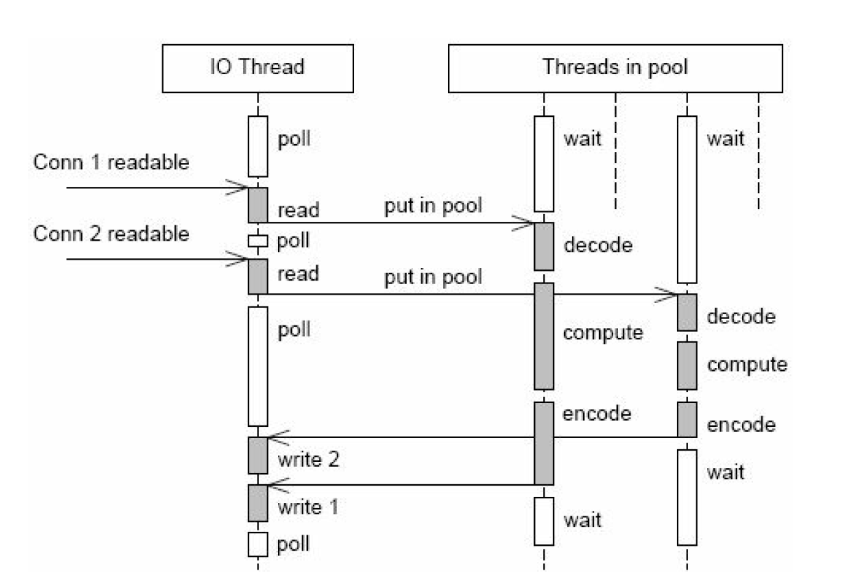 这种方案,只有一个EventLoop,但它把计算密集的部分(decode、compute、encode)分派到一个线程池中处理,处理完后再返回到EventLoop中,这样即使decode、compute、encode这三部分是阻塞的也不影响并发连接,正因为是异步处理,导致打乱了返回的顺序性,也即连接1比连接2先到,但有可能连接2先返回数据。如果处理的事情没有优先级之分或者计算密集型(大部分时间都是处于计算中)可以使用这种方案,如果有优先级之分,应该使用方案9,方案9算是一个各方面都比较均衡的网络编程模式,evpp库就优先使用这种模式。