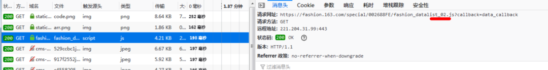 会出现一大堆东西,但是不用慌,我们可以根据类型去寻找,一般图片信息肯定实在html、js或json格式的文件中,一个一个点进去看看,很快就找到了结果: