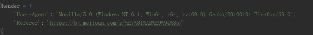 这类反爬网站也很常见,例如美团,仅仅加User-Agnet还是返回错误信息,这时就要把Referer值也加到头部信息中: