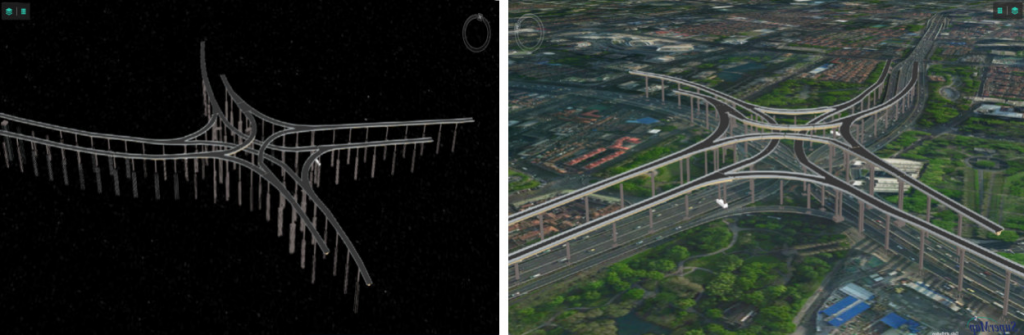 在GIS平台中载入高架桥的BIM数据(左),并累加在影像数据上(右)