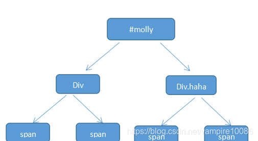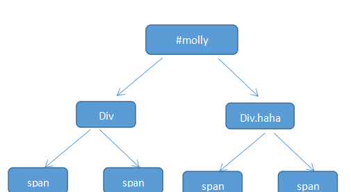 浏览器从右向左读取选择器,先找到span然后顺着往上找到class为haha的div,然后再找到id为molly的div的元素。