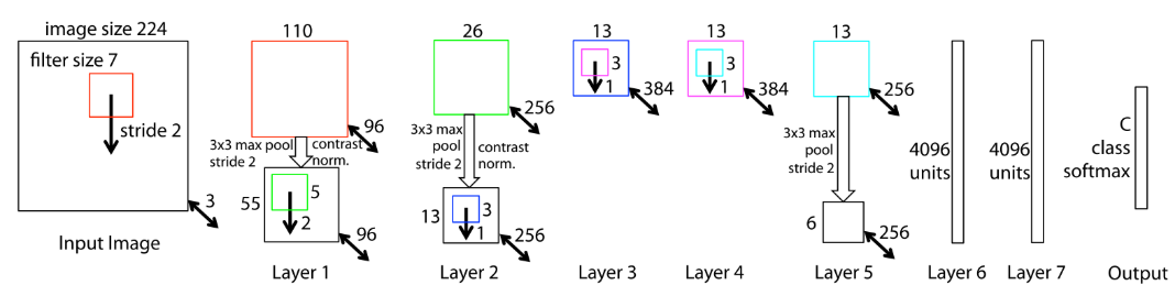 - 将AlexNet的第一层的卷积核大小从11x11改成7x7。同时针对第二个问题将第一个卷积层的卷积核滑动步长从4改成2