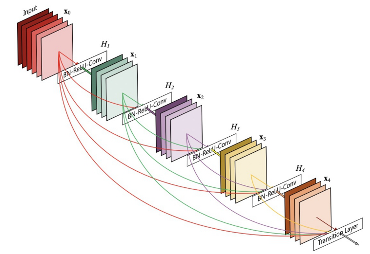 先前的网络因为使用了shortcut连接,网络已经变得越来越深了。接着引入了要介绍的DenseNet,正是利用了shortcut连接的思想,每一层都将前面所有层的特征图作为输入,最后使用concatenate来聚合信息。实验显示,DenseNet减轻了梯度消失问题,增大了特征重用,大大减少了参数量。DenseNet使用了concatenate来聚合不同的特征图,类似于ResNet残差的思想,提高了网络的信息和梯度流动,使得网络更加容易训练。