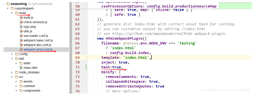 6、在vue项目中给静态资源添加版本号。方式是在build文件夹下的webpack.prod.conf里的搜索HtmlWebpackPlugin处,添加hash值就可以了。如下图