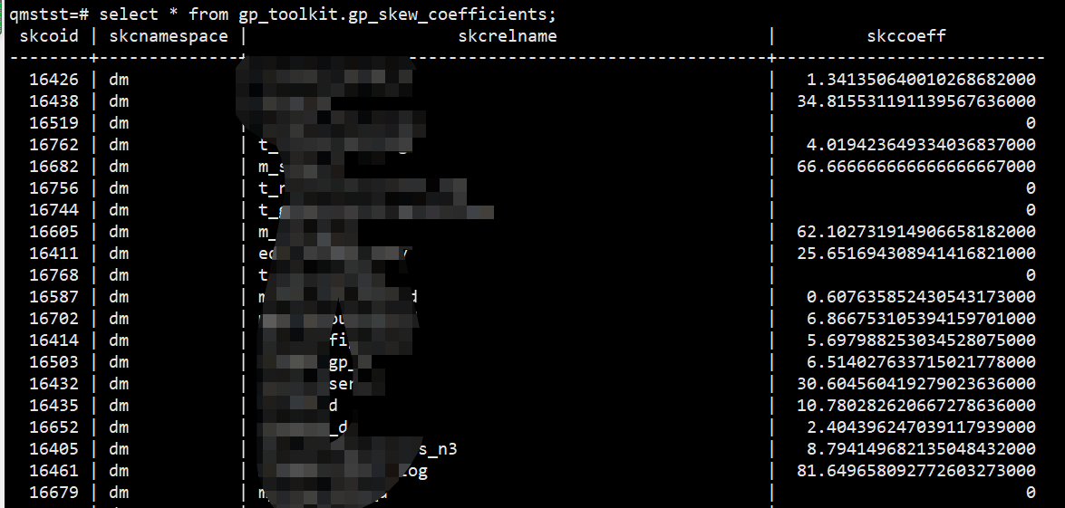 The gp_toolkit.gp_skew_coefficients view shows data distribution skew by calculating the coefficient of variation (CV) for the data stored on each segment. The skccoeff column shows the coefficient of variation (CV), which is calculated as the standard deviation divided by the average. It takes into account both the average and variability around the average of a data series. The lower the value, the better. Higher values indicate greater data skew.
