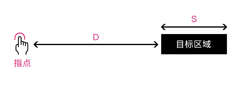 费茨定律指的是:使用指点设备到达一个目标的时间,与当前设备位置和目标位置的距离(D)和目标大小(S)有关。用数学公式表达为:时间 T = a + b log2(D/S+1)。如下图: