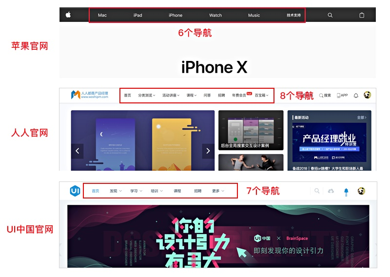 案例一:比如苹果、人人都是产品经理及UI中国官网导航栏