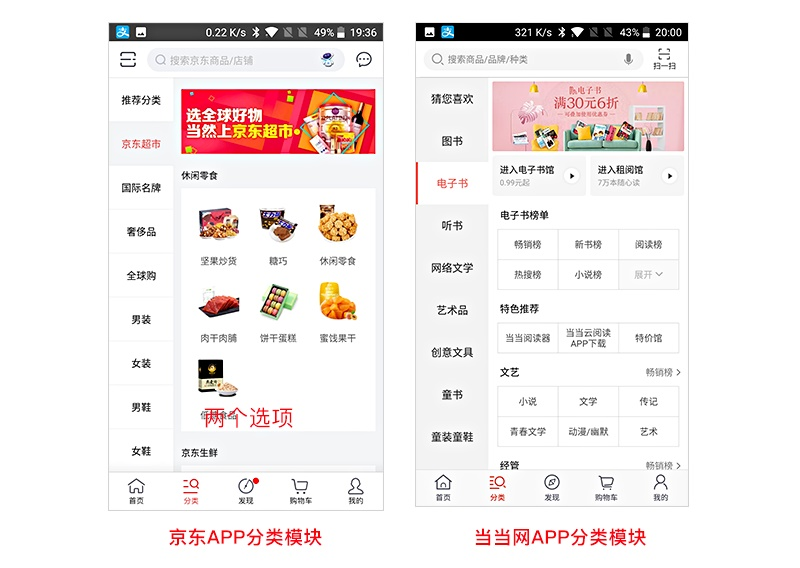 下图分别为京东及当当网APP的商品分类模块界面,我们不难看出,两个产品的商品分类布局形式很相似,都是用了选项卡的方式来分类商品,层级明确,相应的提升了用户找寻商品的效率。