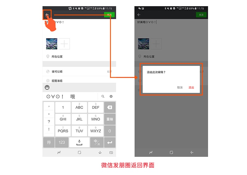 案例二:比如安卓版微信发朋友圈动态时,点击返回按钮出现的提示弹窗