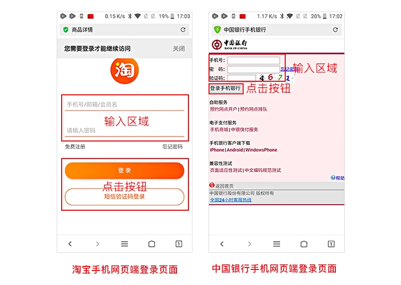 案例一:比如淘宝和中国银行的手机网页端的登录页面