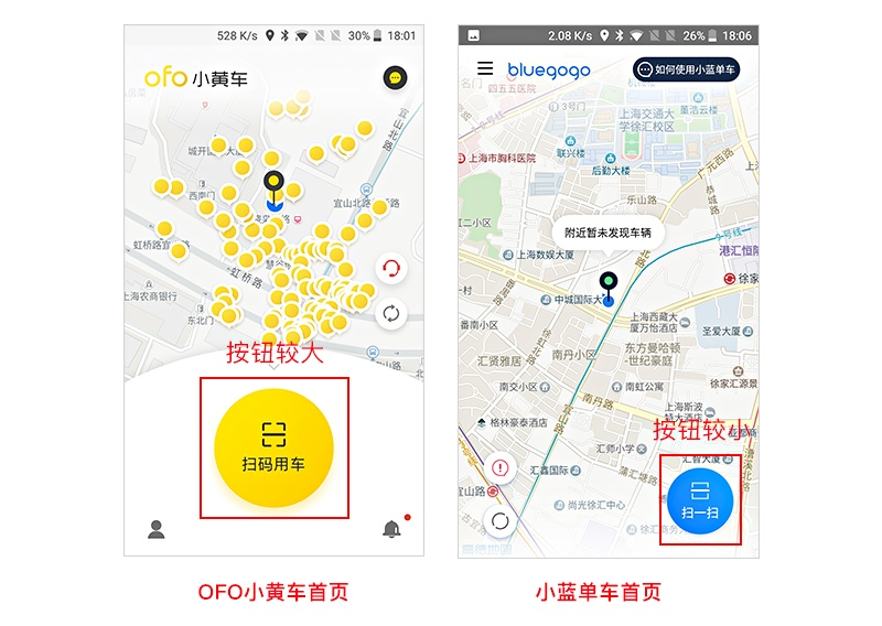 小黄车和小蓝单车首页最重要的扫码用车按钮不约而同的使用了圆形按钮,我们不看放置的位置,单看按钮大小,小黄车的明显要比小蓝单车的大很多。笔者在使用两者的时候,小黄车的操作按钮要比小蓝的舒服很多,因为小黄车的按钮比较大,比起小蓝单车的按钮更容易点击。