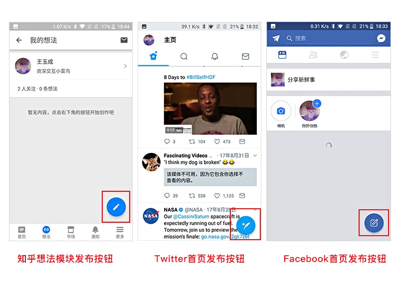 案例一:比如移动端的知乎、Twitter及Facebook内的发帖按钮