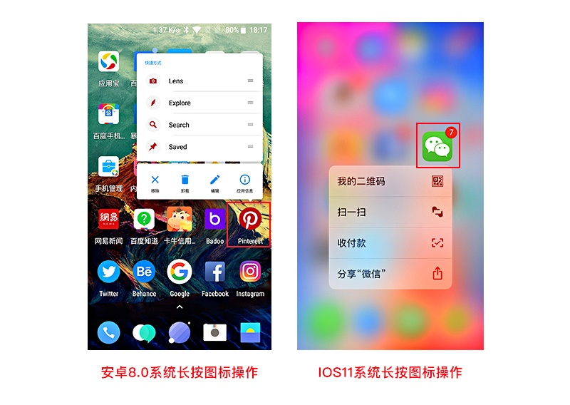 案例一:安卓8.0及iOS11系统手机内长按APP出现的菜单