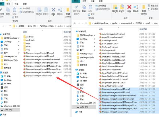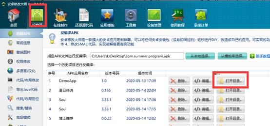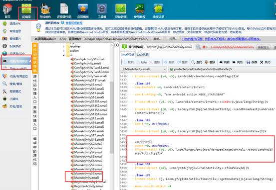 第二步:将上述Demo的Apk文件通过安卓修改大师反编译,反编译后获得smali代码,将获得的代码和资源复制到目标项目中进行整合。