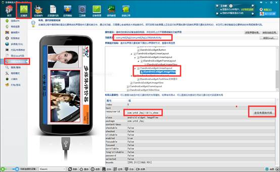 确保手机和电脑连接成功,安卓修改大师底部处于连接状态,点击修改大师左侧的代码布局定位功能,手机上面浏览到需要添加和修改布局的页面,然后点击上述页面上的抓取界面布局按钮,即可获取当前页面的界面布局和布局层次情况。点击左侧预览图的需要添加插件的区域,右下角会显示该控件的id名称(iv_show),点击右侧的定位布局和代码,将自动进行代码和布局查找工作。