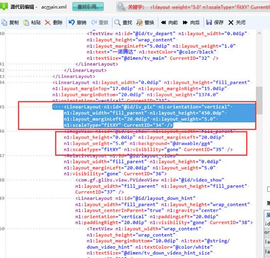 双击查询结果,将进入布局xml界面,下图列出来的是该控件的布局xml(下图下面的红框),一般如果要做界面插入,建议不要动原来的界面元素,因此我们把原来的图片框元素添加 n1:visibility="gone" 进行隐藏,在该元素的上部添加了单独的布局(用来作为轮播控件的宿主控件)元素用来放置新添加的轮播功能(下图的上面红框),请注意为了保持界面布局一致性,确保新插入的布局控件和原来的控件的布局和大小尺寸的属性一样。