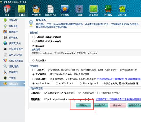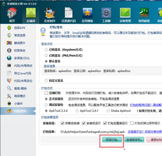 一切修改完毕后,注意在编辑器右上角点击保存,然后回到打包签名进行项目打包,手机点击电脑的话,会自动在手机上面安装打包后的成果apk。
