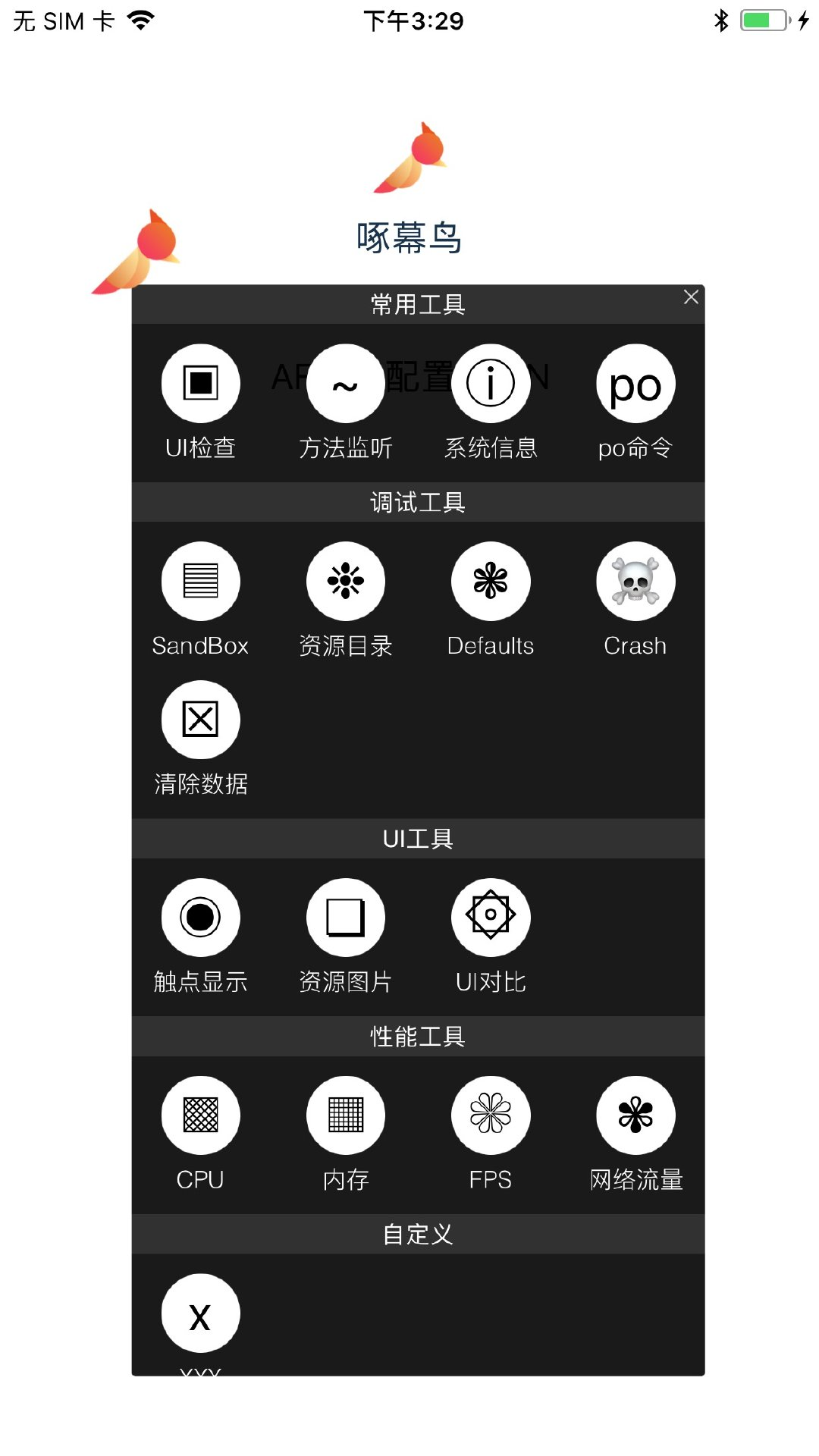 啄幕鸟,即手机屏幕上的啄木鸟,专抓App里的Bug。啄幕鸟集合了UI检查、对象查看、方法监听等多种开发工具,通过拾取UI控件、查看对象属性、监听方法调用、App内抓包等,不依赖电脑联调,直接获取运行时数据,快速定位Bug,提高开发效率。啄幕鸟提供了插件化的工具平台,简便易用,零侵入、零依赖、易接入、易扩展。
