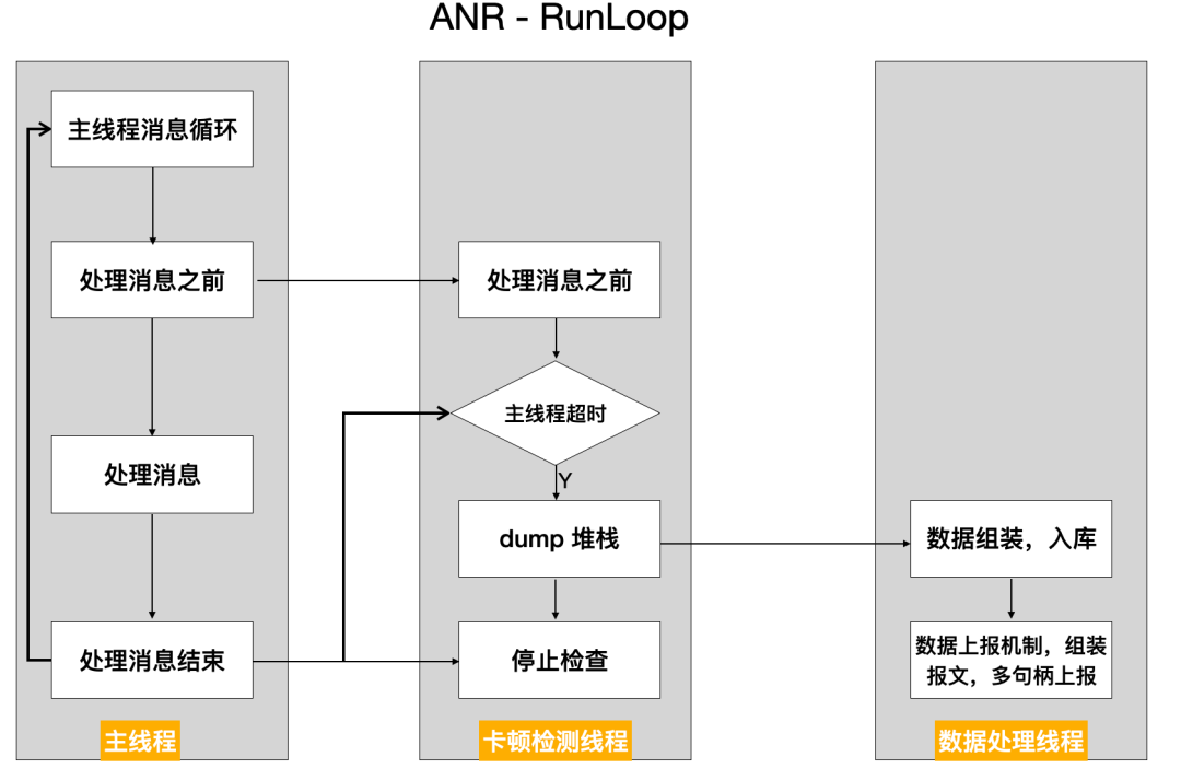 开启一个子线程,创建一个初始值为0的信号量、一个初始值为 YES 的布尔值类型标志位。将设置标志位为 NO 的任务派发到主线程中去,子线程休眠阈值时间,时间到后判断标志位是否被主线程成功(值为 NO),如果没成功则认为猪线程发生了卡顿情况,此时 dump 堆栈信息并结合数据上报机制,按照一定策略上传数据到服务器。数据上报会在 打造功能强大、灵活可配置的数据上报组件 讲