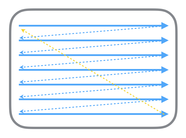 讲讲老式的 CRT 显示器的原理。CRT 电子枪按照上面方式,从上到下一行行扫描,扫面完成后显示器就呈现一帧画面,随后电子枪回到初始位置继续下一次扫描。为了把显示器的显示过程和系统的视频控制器进行同步,显示器(或者其他硬件)会用硬件时钟产生一系列的定时信号。当电子枪换到新的一行,准备进行扫描时,显示器会发出一个水平同步信号(horizonal synchronization),简称 HSync;当一帧画面绘制完成后,电子枪恢复到原位,准备画下一帧前,显示器会发出一个垂直同步信号(Vertical synchronization),简称 VSync。显示器通常以固定的频率进行刷新,这个固定的刷新频率就是 VSync 信号产生的频率。虽然现在的显示器基本都是液晶显示屏,但是原理保持不变。