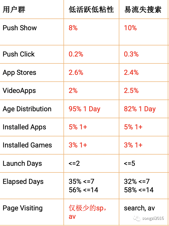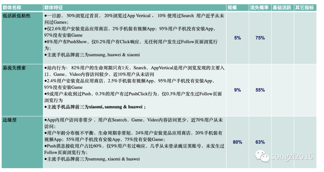 例如 :第三方应用分发这个业务,根据特征可以划分为十几个用户群体,其中有两个群体可以定位为低活跃低黏性、易流失搜索用户群体。